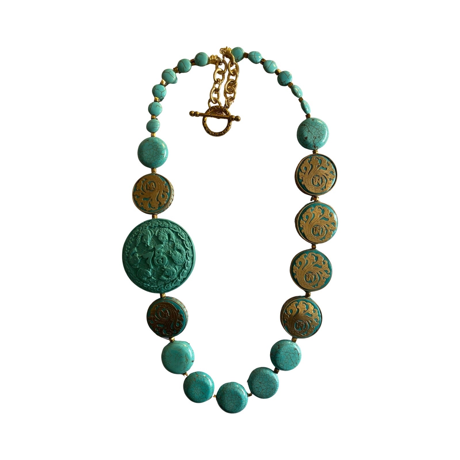 Unique design showcases gold accented turquoise coin beads, turquoise howlite coin beads and a carved turquoise resin focal pendant.