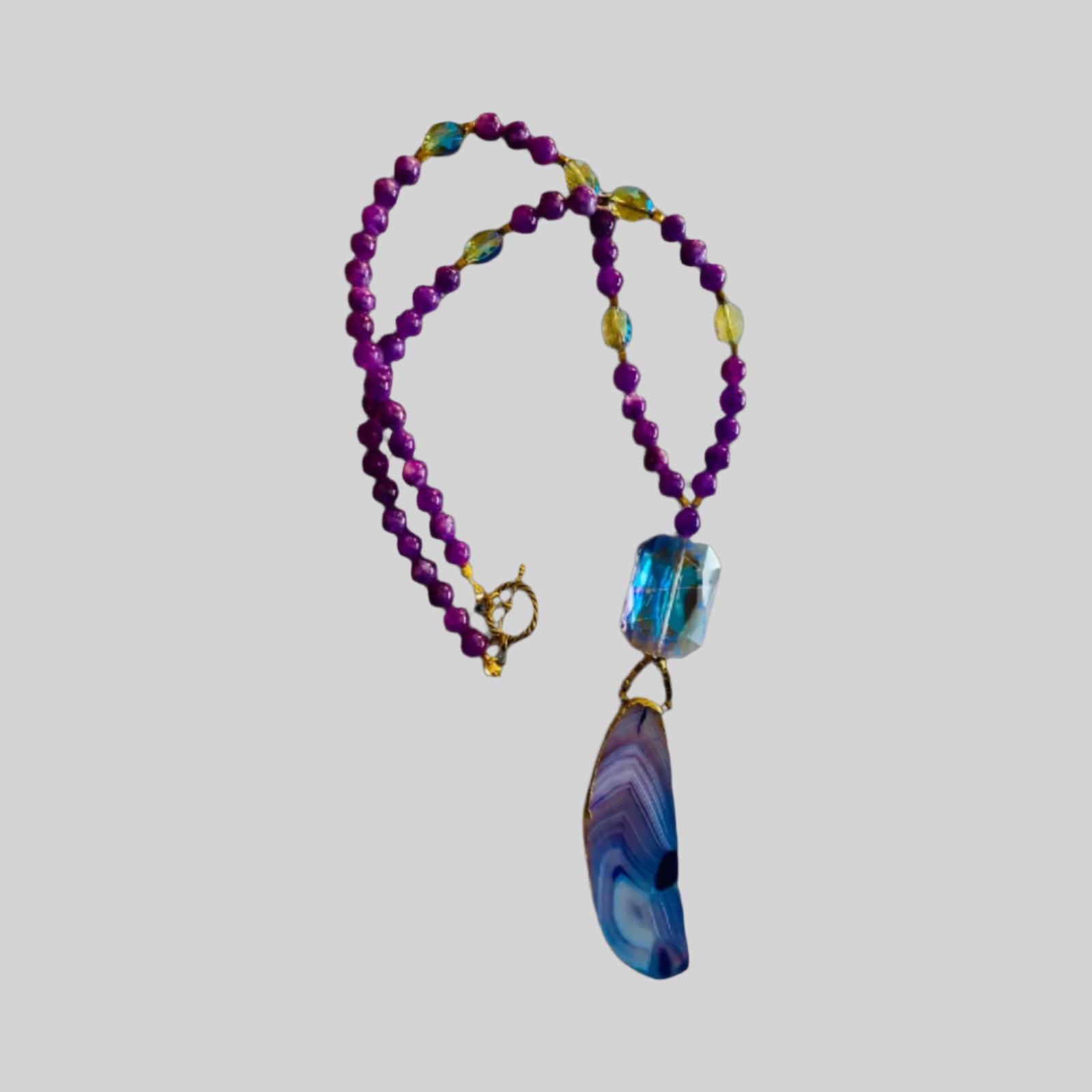 Stylish Y necklace design features a gold trimmed agate slab, accented with amethyst beads and purple iridescent crystals.